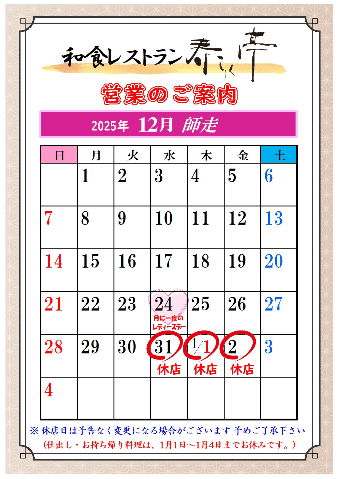 2025年11月レストラン営業カレンダー
