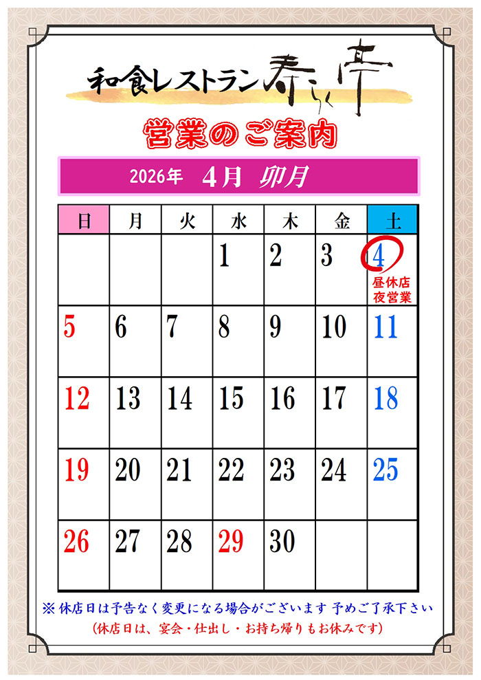 2026年4月レストラン営業カレンダー